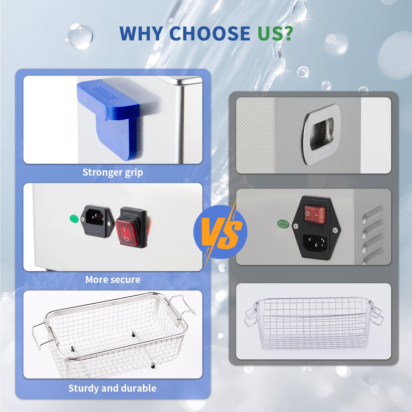 The cleaning tank and drain valve are made with SUS304 stainless steel. SUS304 stainless steel does better in resistance to weak acid or weak alkali solution. However, SUS304 stainless steel materials has no resistance to strong acid or strong alkalis solution, such as hydrochloric acid.