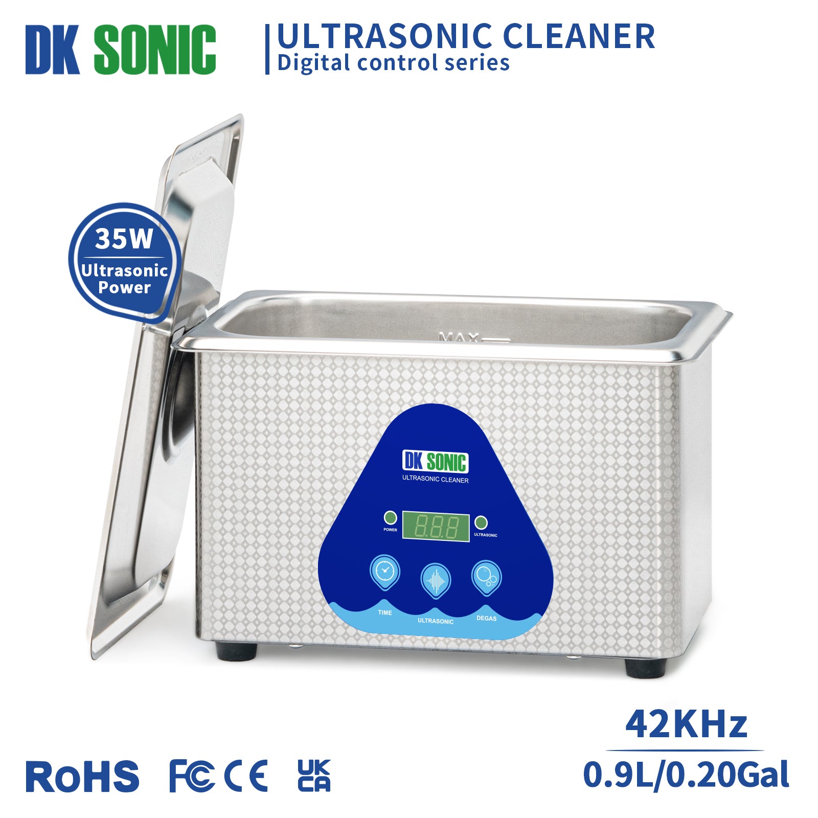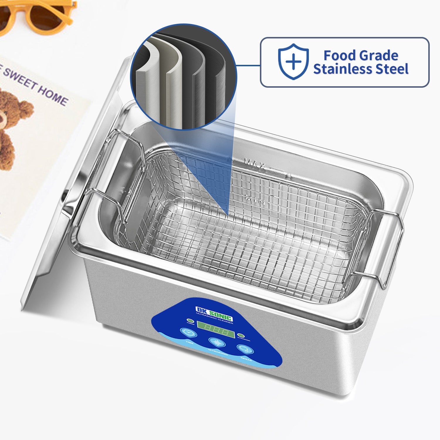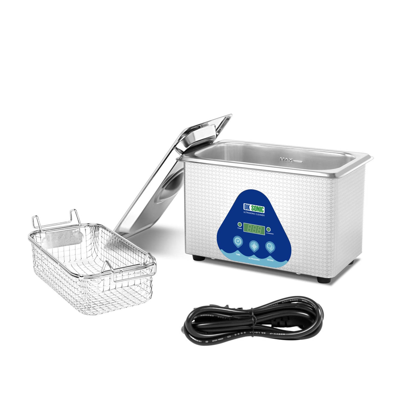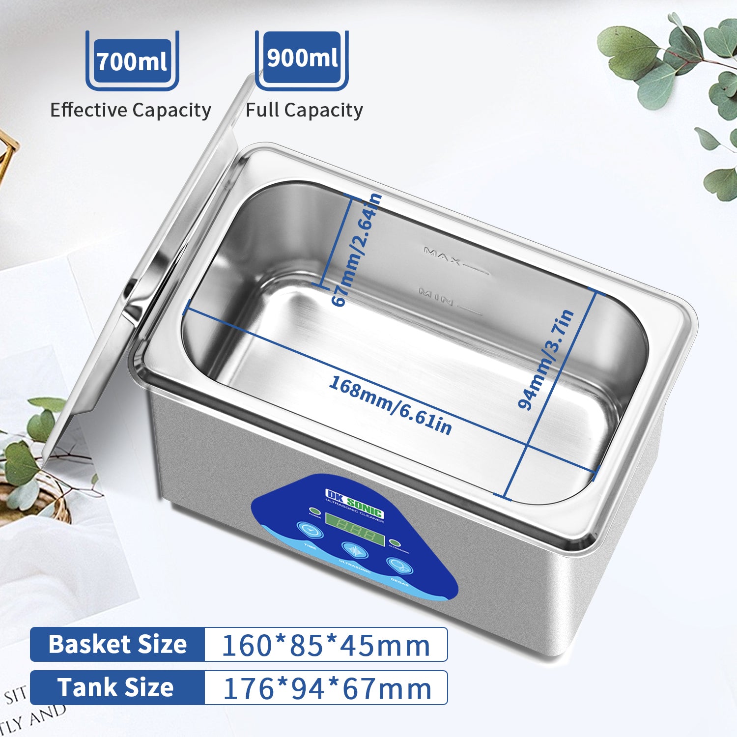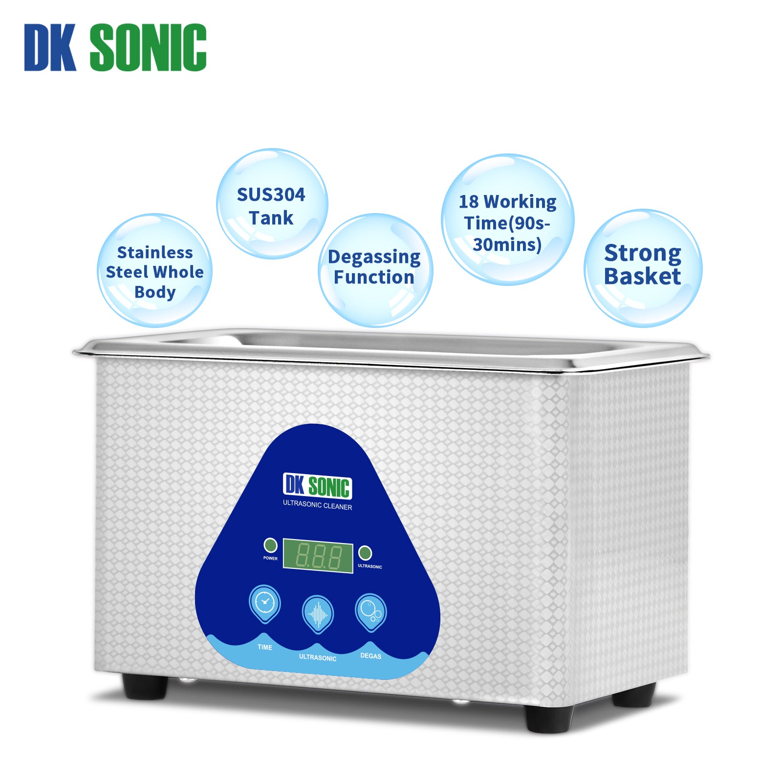 The ultrasonic cleaning machine features two smart buttons on its panel: one for intelligent timing and the other for degasification. With 5 preset modes, you can set the cleaning duration from 180 seconds to 900 seconds