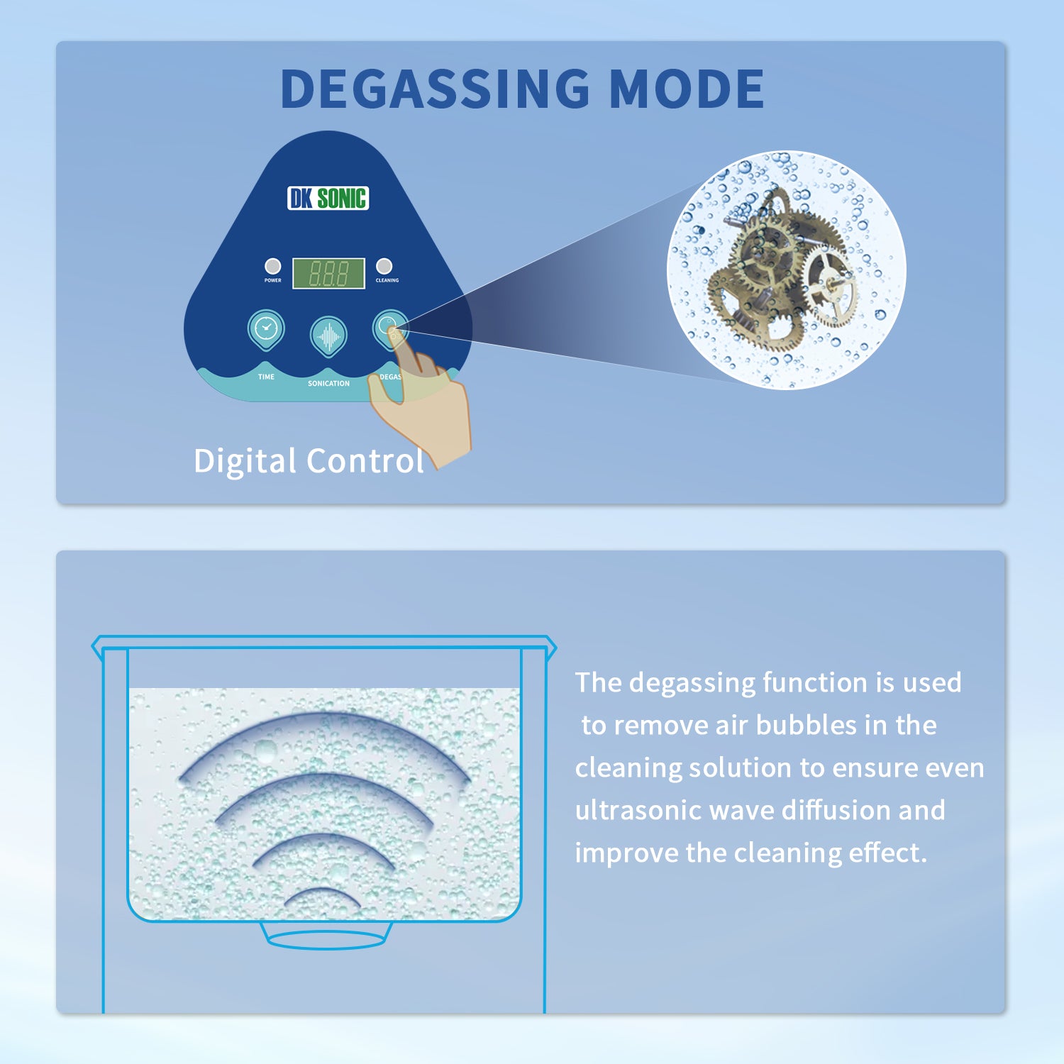 FULLWAVE mode(40KHz) for intensive rinse of blind holes or complicated surfaces; SEMIWAVE mode (semiwave based on 40KHz, i.e. 33KHz) for rough surface cleaning; DEGAS mode for removing ultrasonic fatigue so as to improve cleaning effect; PULSE mode for dynamic rinse of stubborn stains